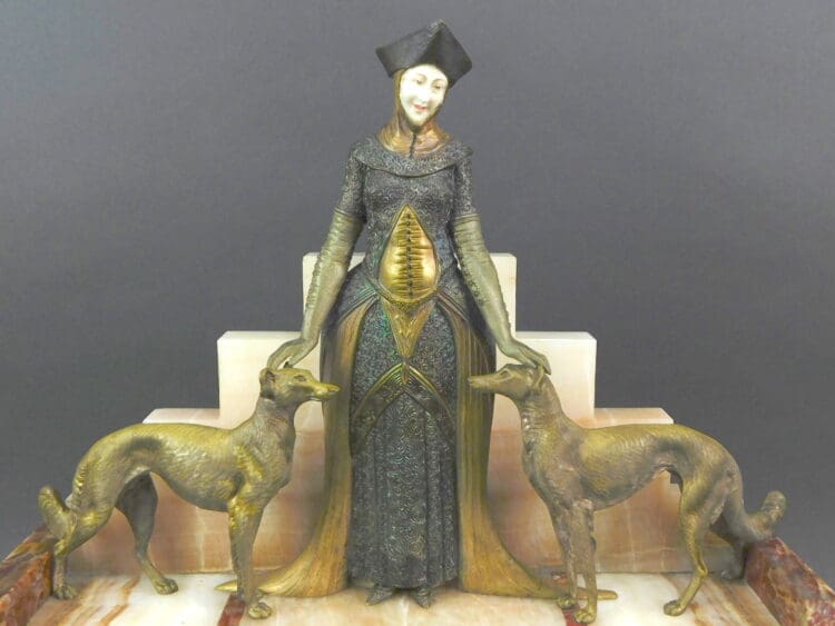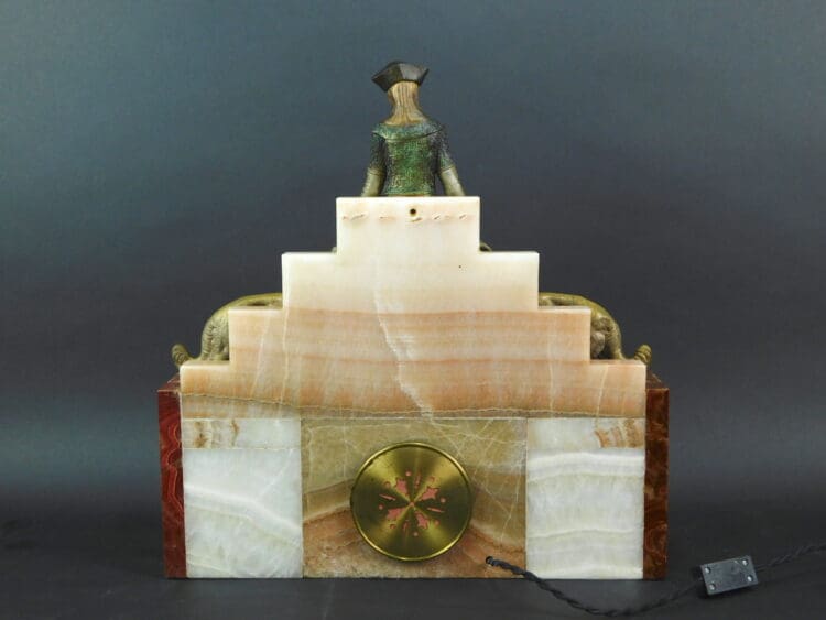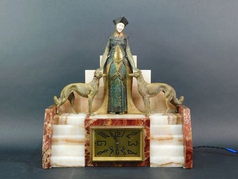 French chryselephantine clock of a medieval venetian lady with her two dogs. The base of this clock lights up at each end. Signed Scribe to the marble on the top of the clock.