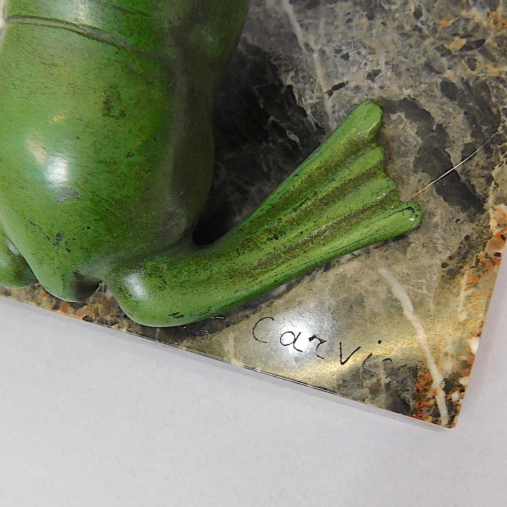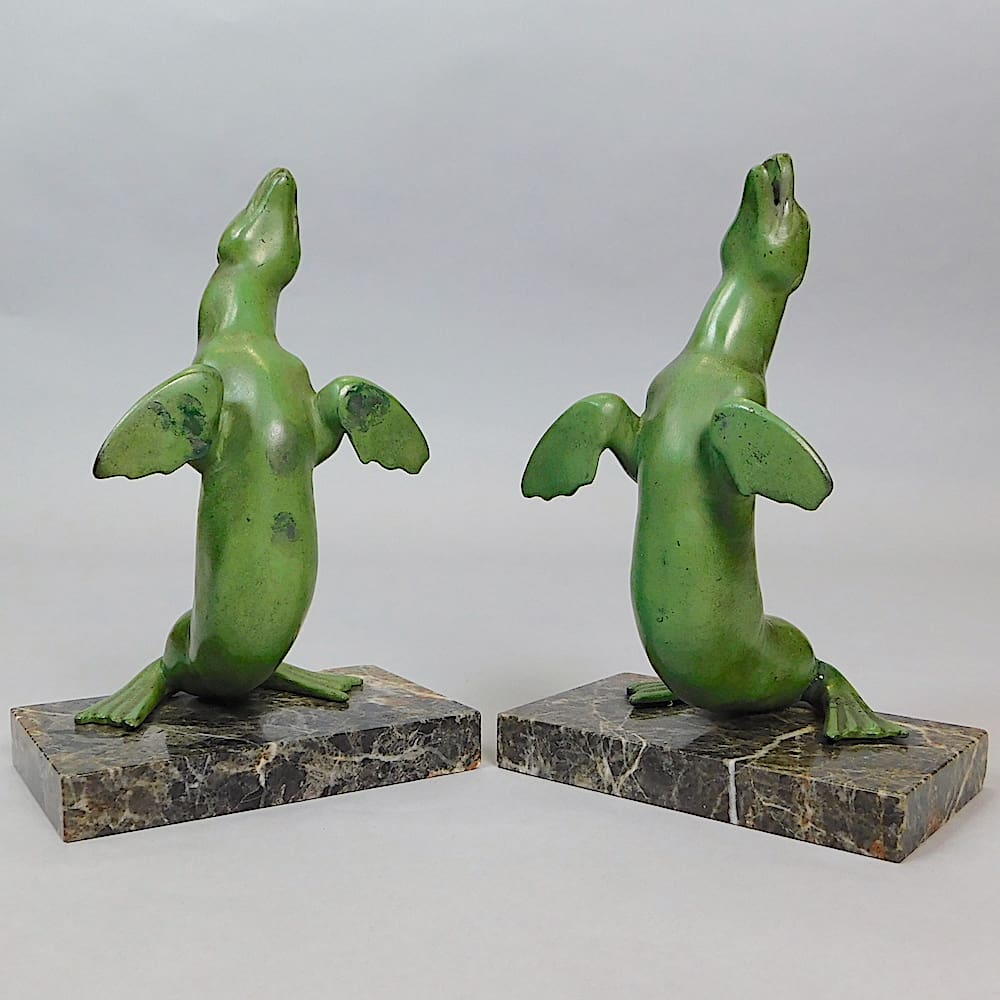 Green patinated spelter art deco bookends as sea lions mounted on marble bases.