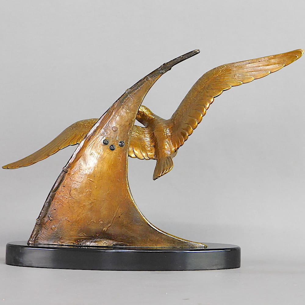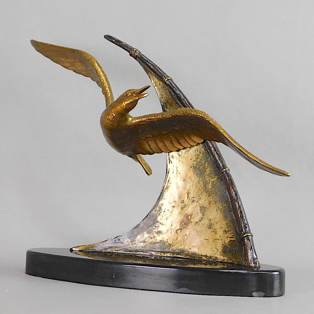 French art deco bronze of a seagull flying in front of a yacht sail.
