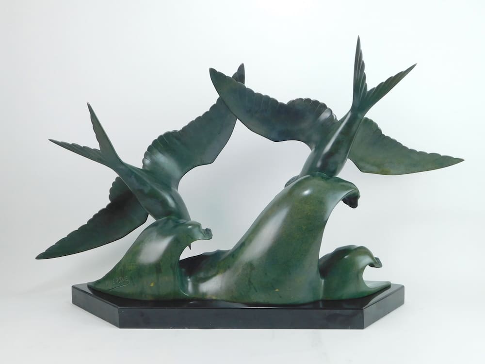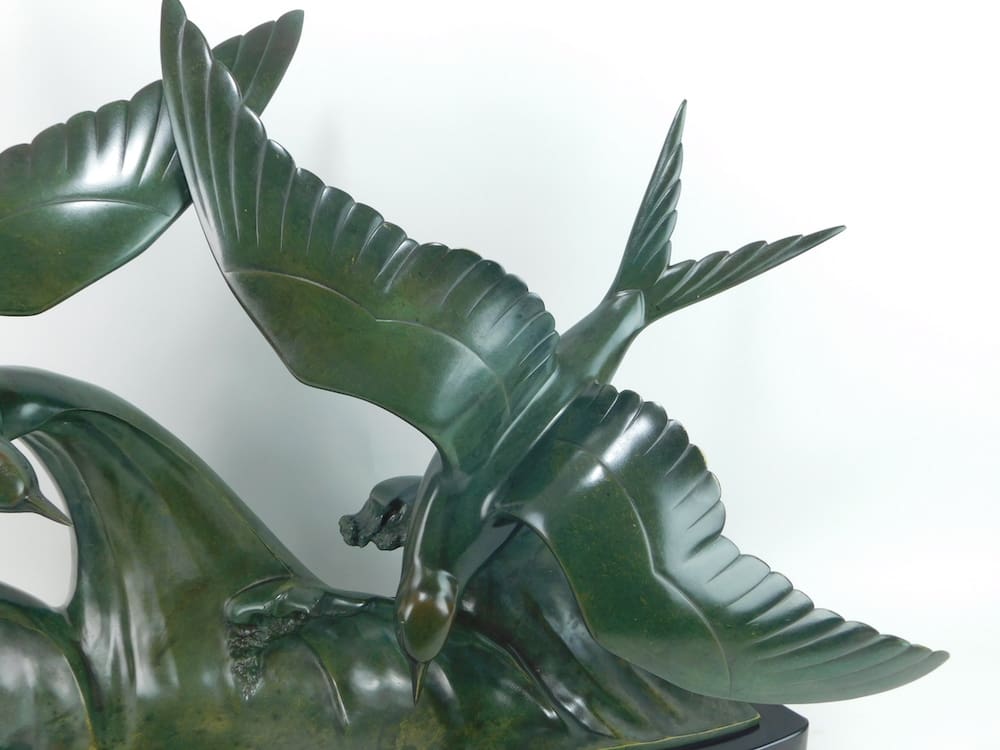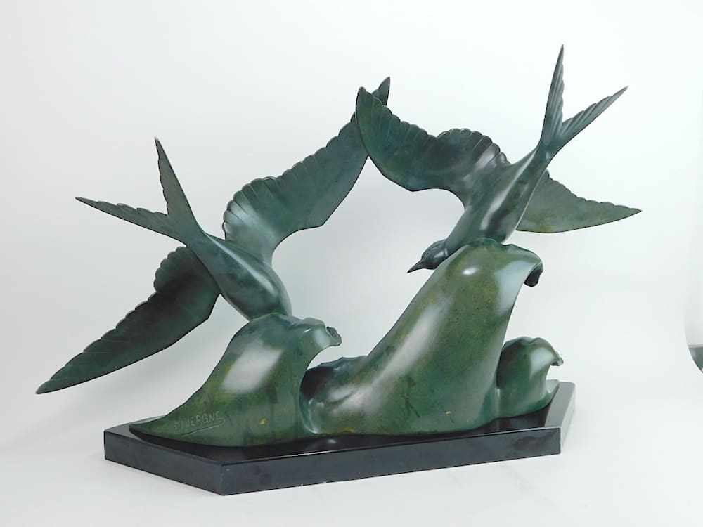 Large and impressive art deco bronze seagulls statue, a signed piece by Davergny. Signed in the bronze and stamped bronze to the metal.