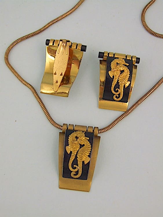 Brown phenolic and gilt metal seahorse necklace and dress clips set. Made in the late 1920s/early 30s by the JHP company of Paris.