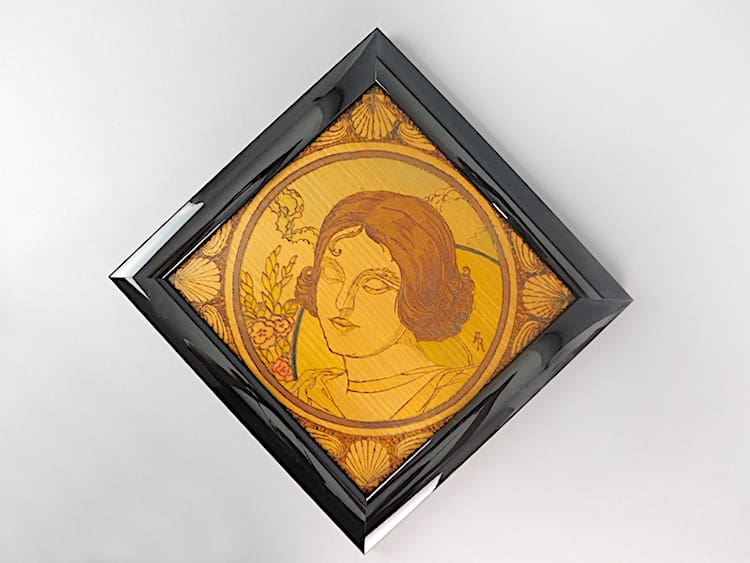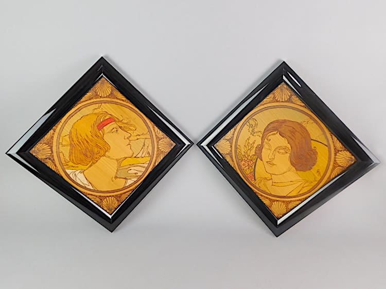 Set of two signed (AR) French hand painted and pyrography engraved female panels. Originally available as a set of two or the full set of four set – representing, Spring, Summer, Autumn and Winter. I have had them professionally framed in high gloss black wooden frames.