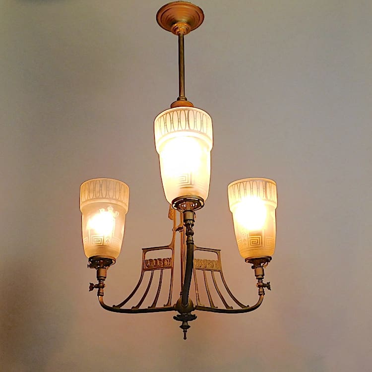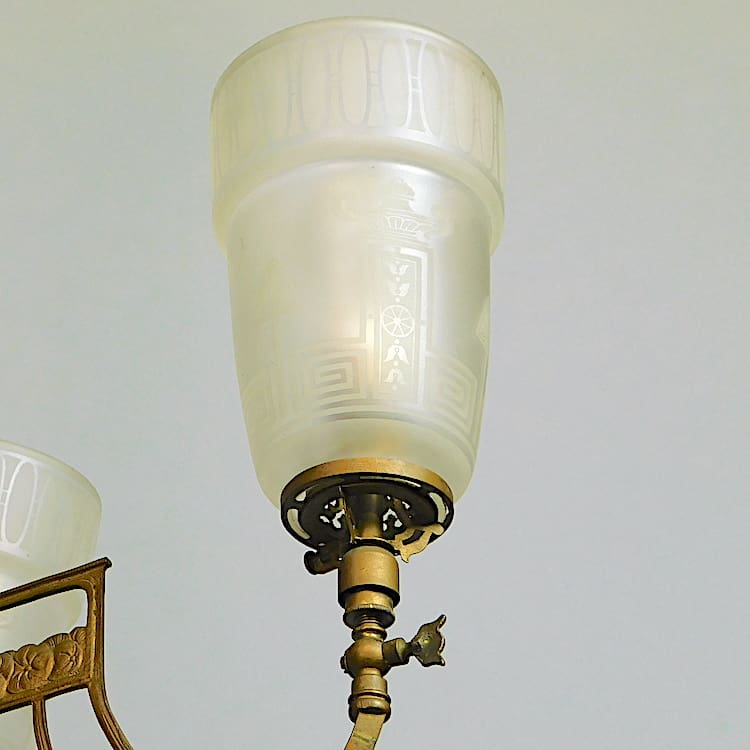 Art Nouveau guilt gas light converted to electricity and retaining its original feature fittings.