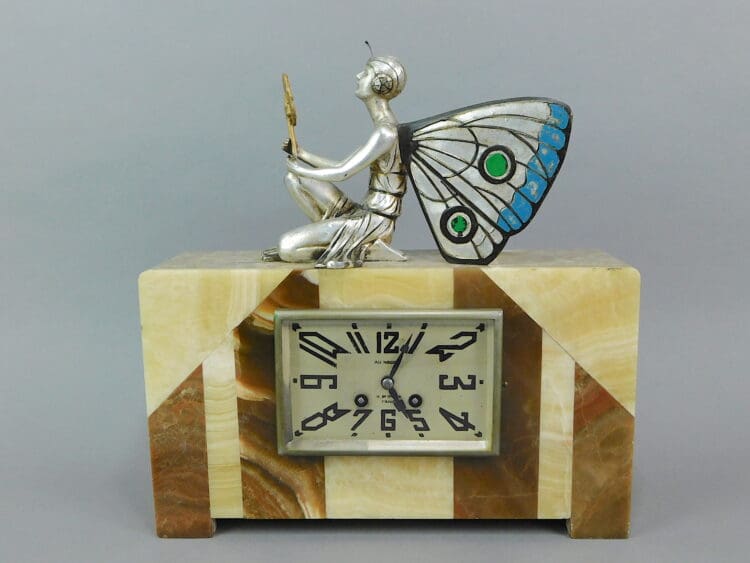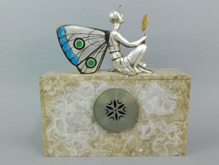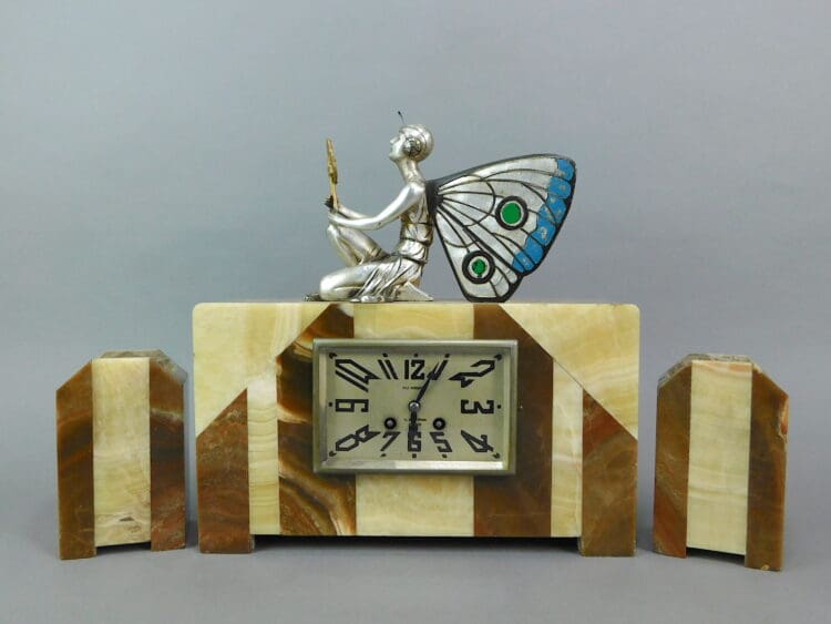 French art deco spelter winged fairy clock set signed Sega. Complimented by matching side pieces.