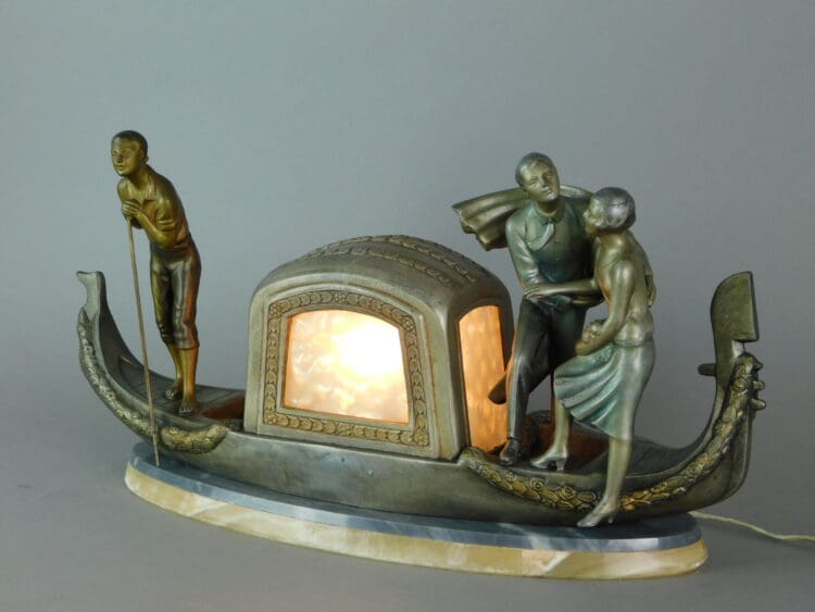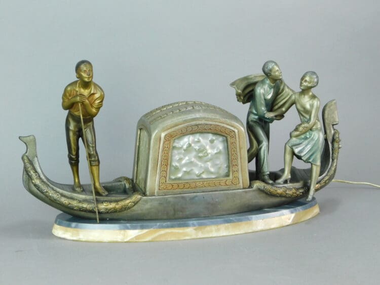French spelter figural group of a gondola with the windows having pearlised celluloid panels which light up by the internal bulb inside the cabin. The ovular base is of grey and cream onyx and it is signed P. Sega to the rear of the boat.
