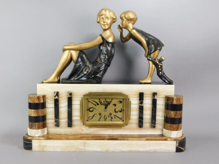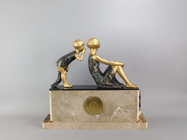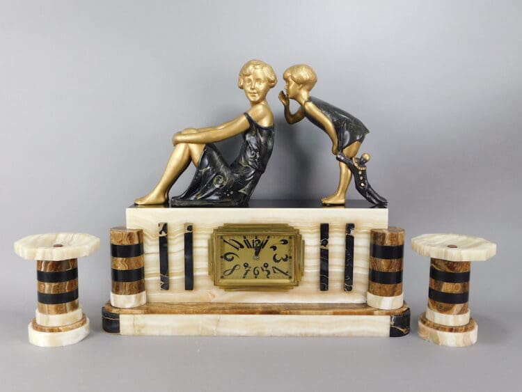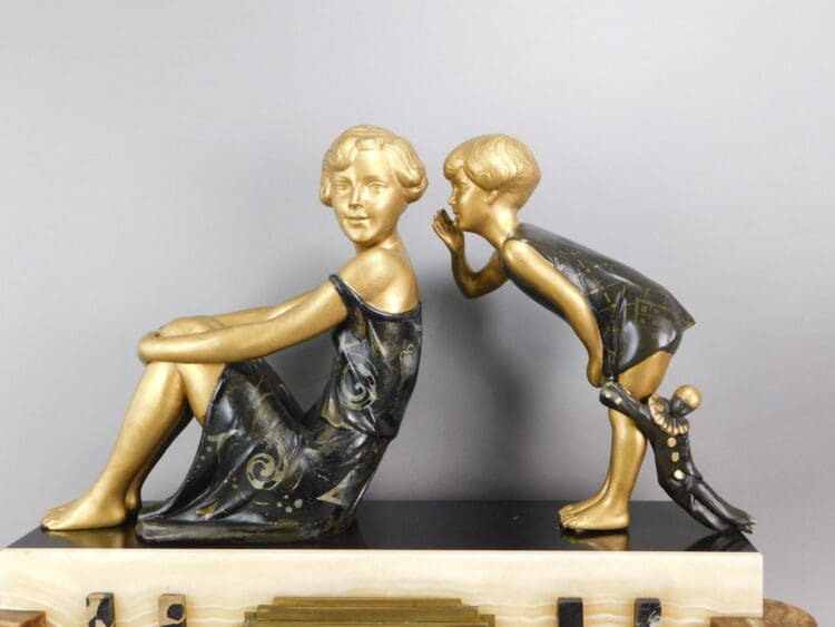 Signed 3 piece clock set with 2 large spelter figures to the top – a child holding a pierrot rag doll and whispering to her mother.