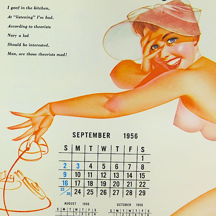 George Petty calendar girls page. Ideal for framing as a group as I have many Petty. Varga and other artists calendar girl pages. This one dates to 1956 and is September.