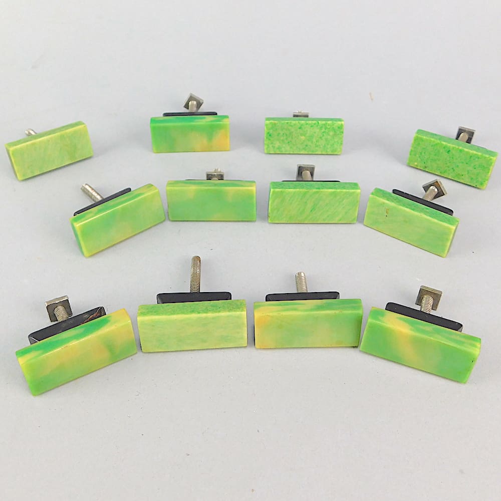 Set of 12 matching 1930s phenolic art deco cabinet handles in jade green and black.