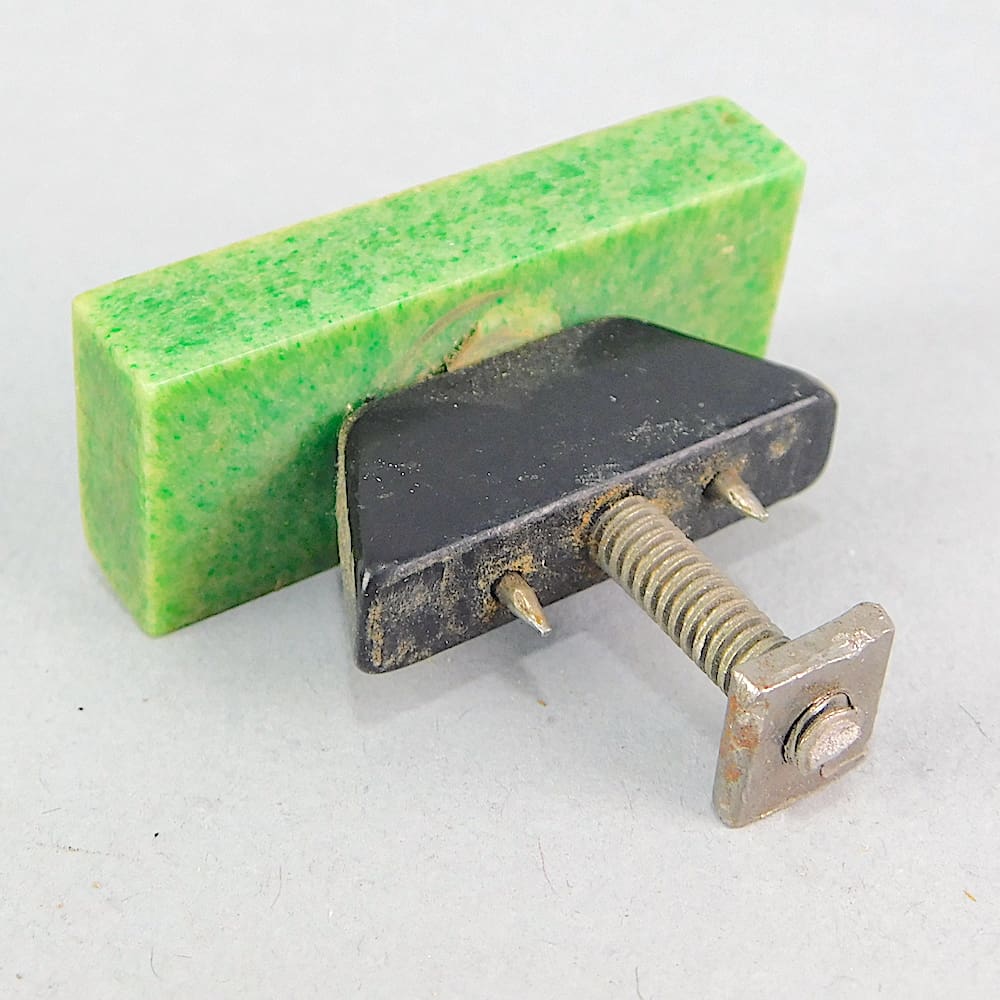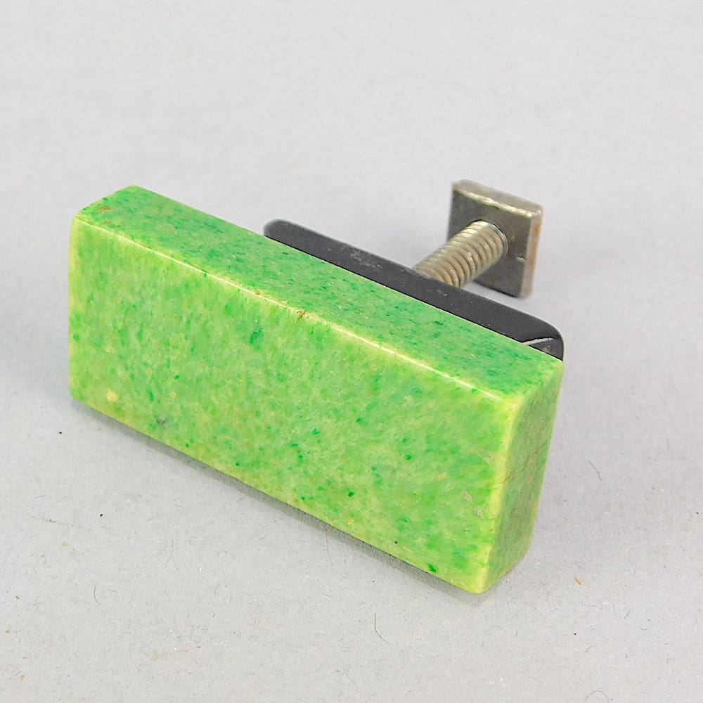 Probably removed from a chest of drawers, each with a marbled jade green rectangle with a black triangular shaped back plate.