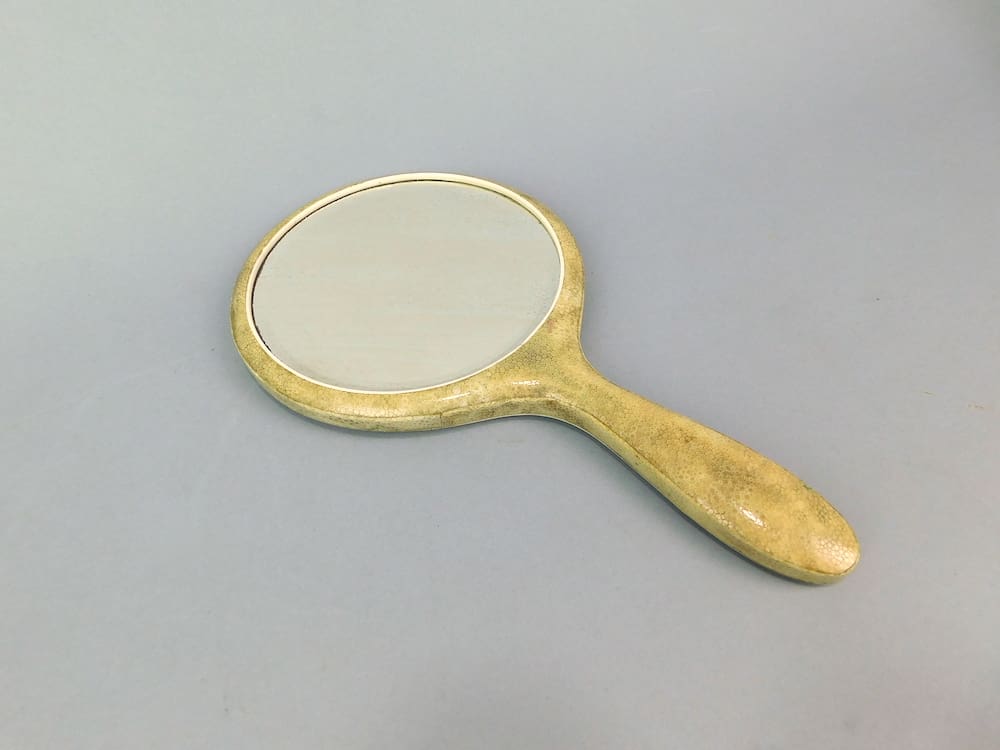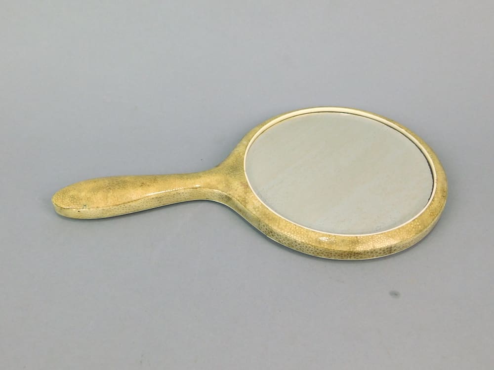 A shagreen and ivory hand mirror with bevelled edge glass and shagreen and ivory edged back.