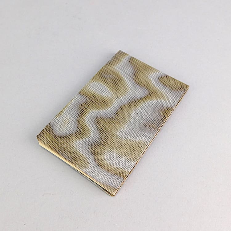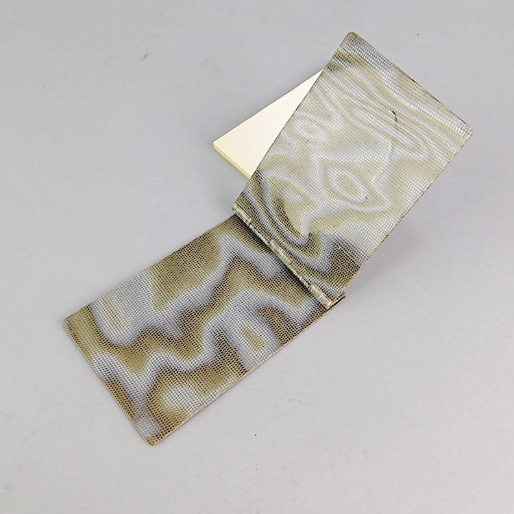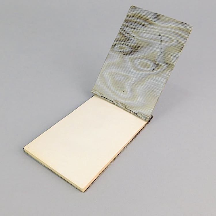 Swedish shagreen effect celluloid notebook case with a silver plated floral and leaf logo in metal and a book of paper inside.