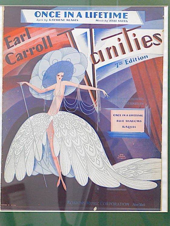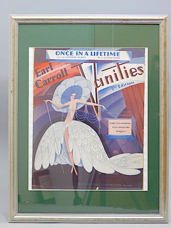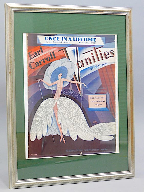 This delightful music book, of which only the cover is visible in the frame, is a full colour period picture entitled Earl Carol Vanities depicting theatrical flapper girl in feathered skirt and hat. The rest of the book and musical annotations are still present within the frame. Current photograph shows the item in a plastic cover, new pictures coming soon.