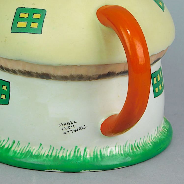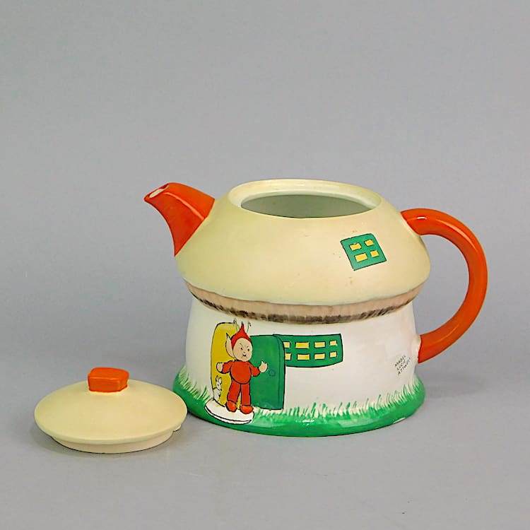 Nursery ware tea set by Mabel Lucie Attwell for Shelley consisting of a Boo teapot house and mushroom milk jug and sugar bowl. They are all signed under the base Shelley England. Beautifully hand painted.