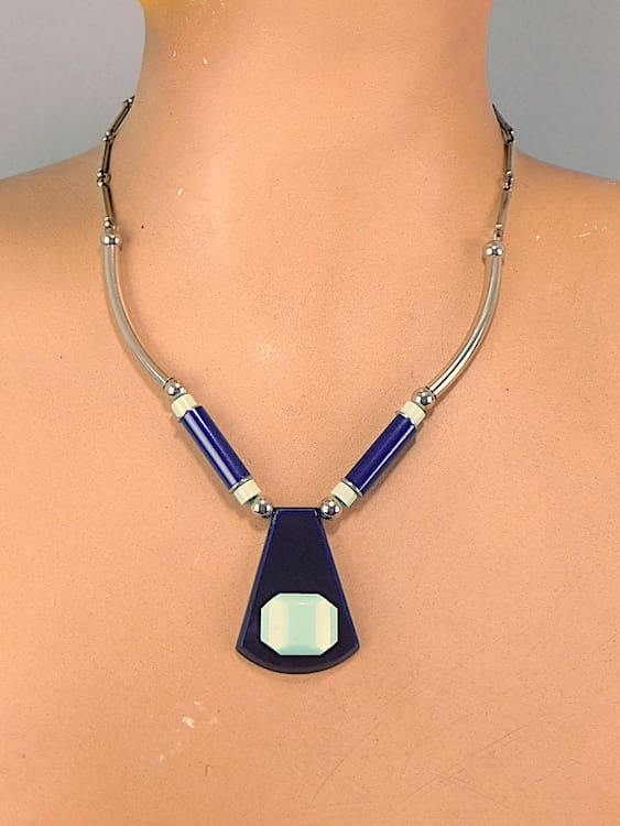 Made in the early 1930’s, navy and turquoise galalith pendant and chrome necklace by Bengel.