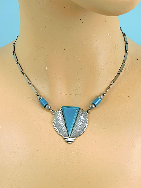 Very art deco, machine age necklace made in the early 1930’s. Blue galalith and tapped chrome central medallion and beads.