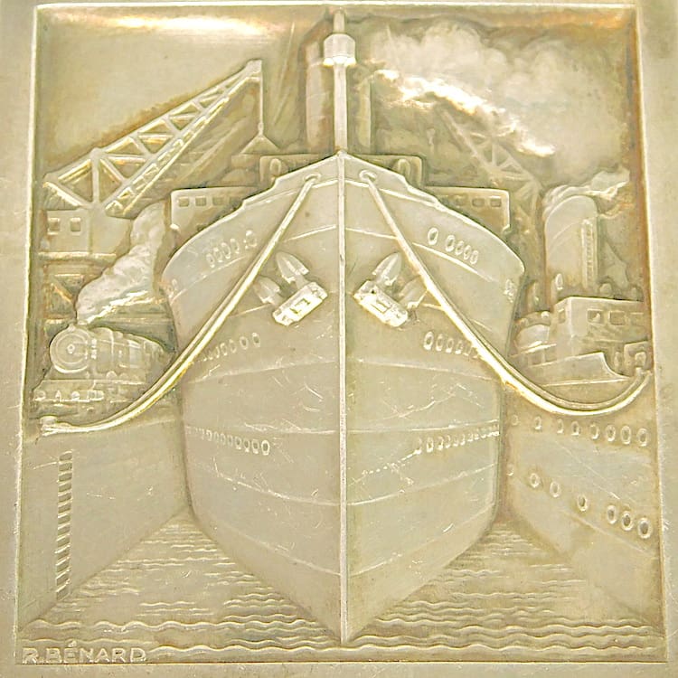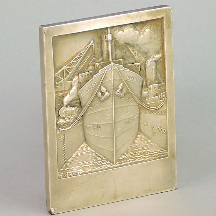 French silvered bronze medal of a docked ship – Signed R. Renard.