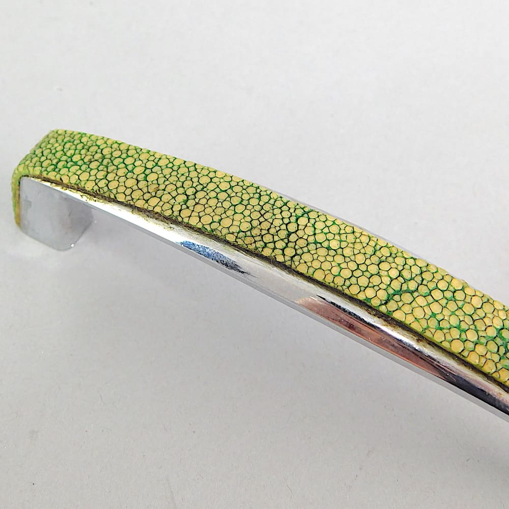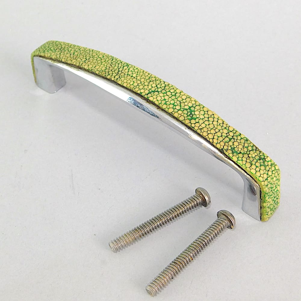 Chrome and shagreen cupboard handles taken from a boat. There are 6 of them in total and come with the fixing screws.