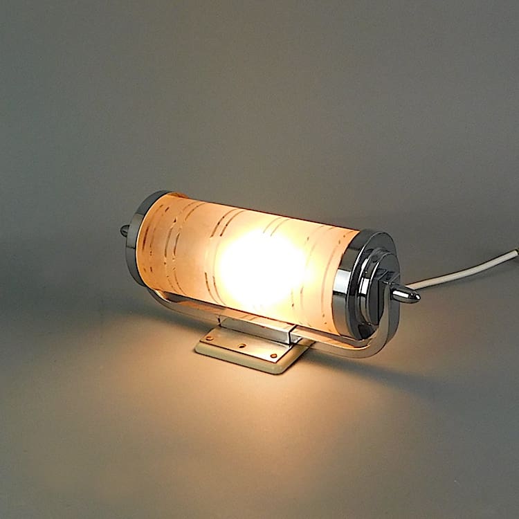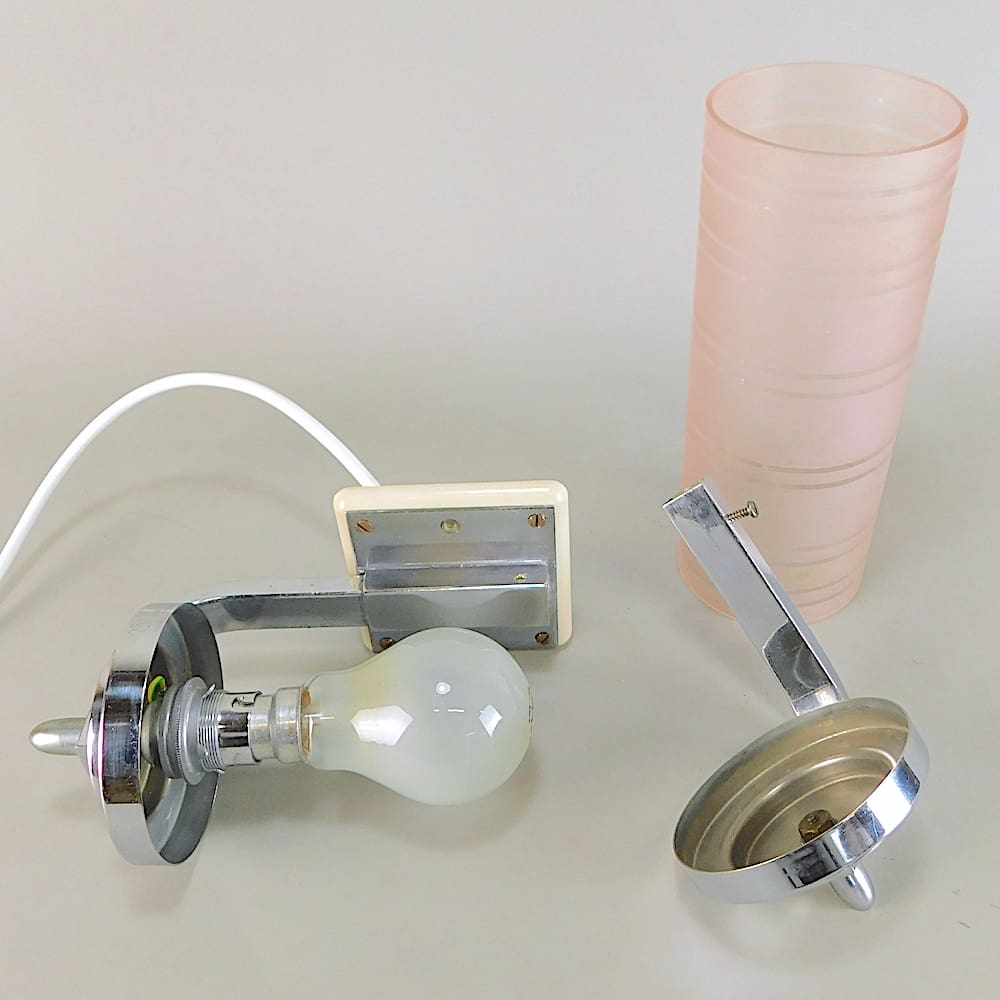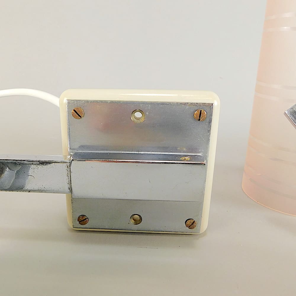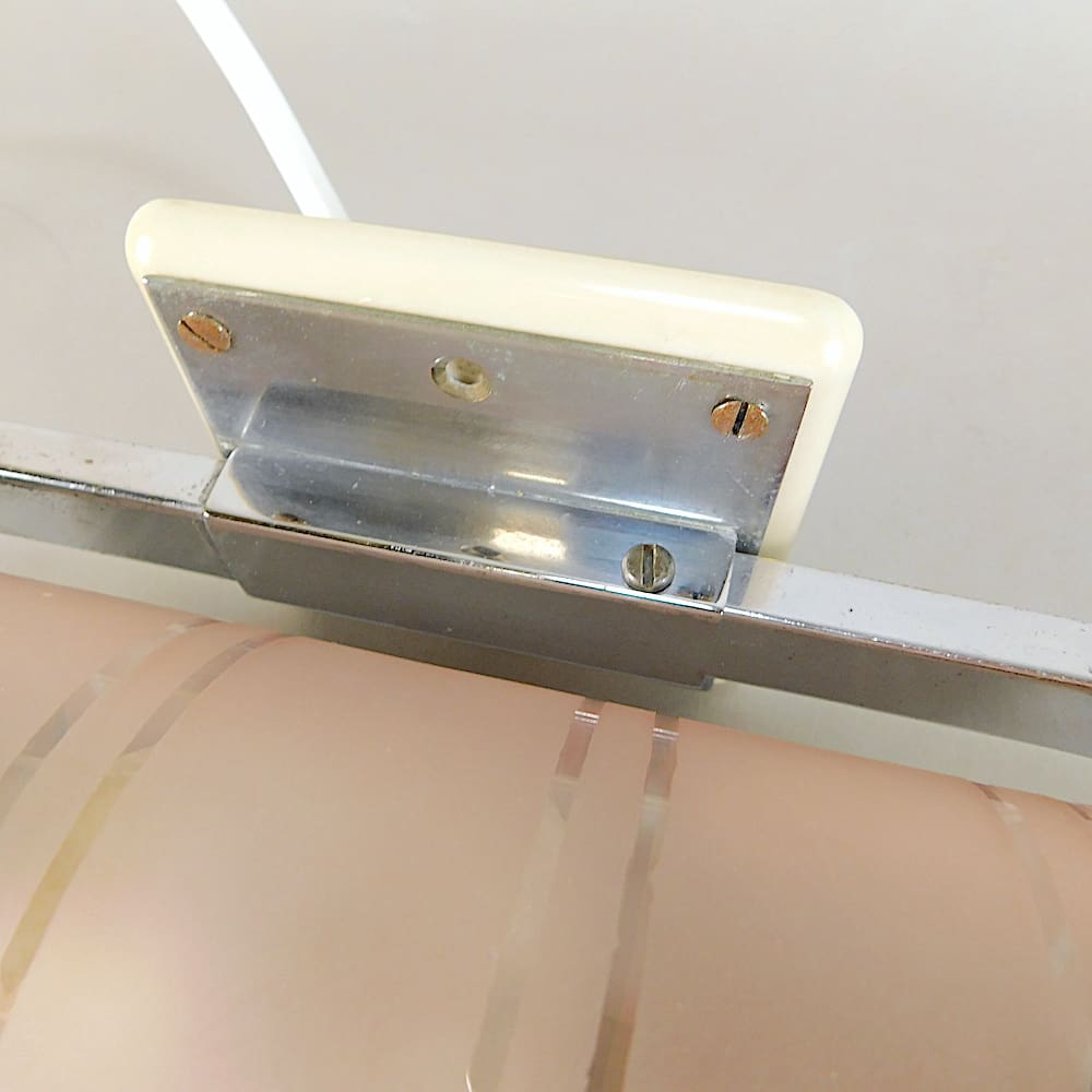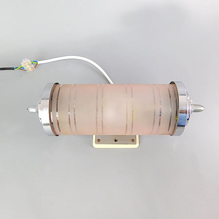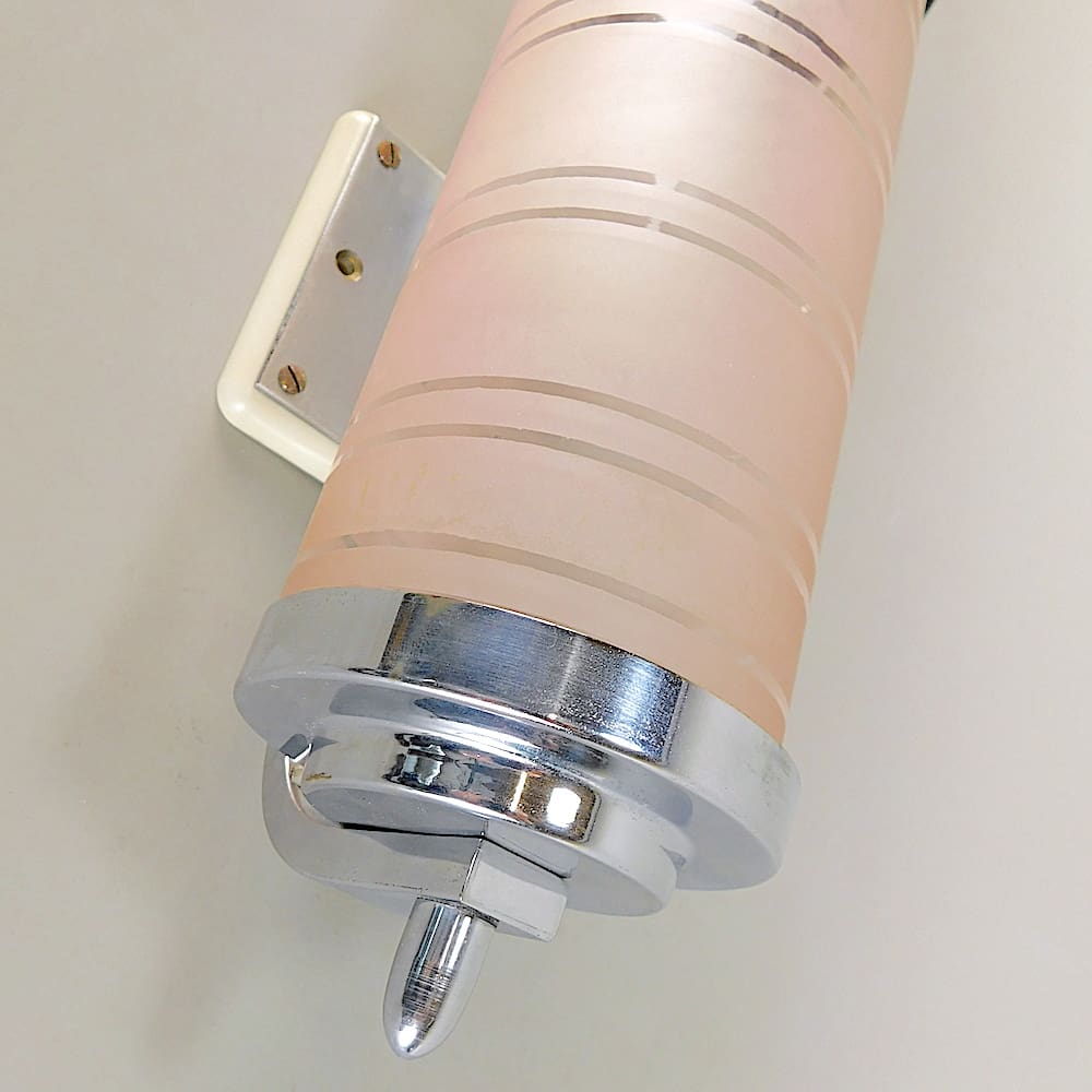 Pink glass tube with band detail held in a chrome metal frame. Ideal as a wall light or a picture light.