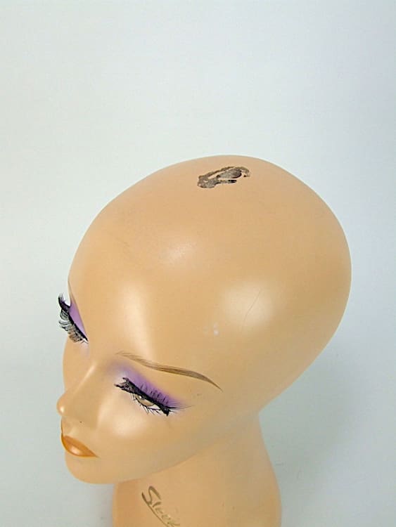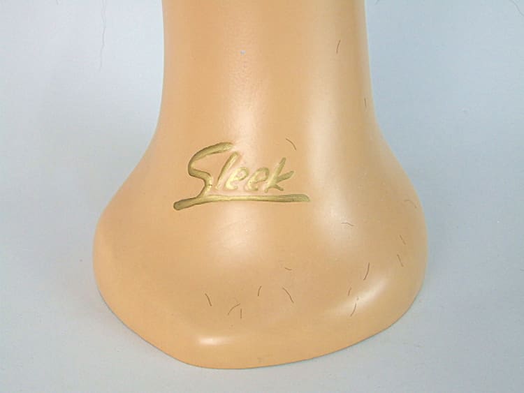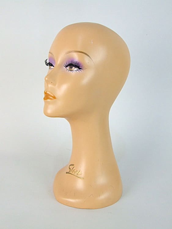 Art Deco shop mannequin probably dates to the 1950s. She is beautifully hand painted and has false eye lashes and marked Sleek to the front of her neck. Made of resin material. The mark on her head appears to be glue which likely held a wig to the head.