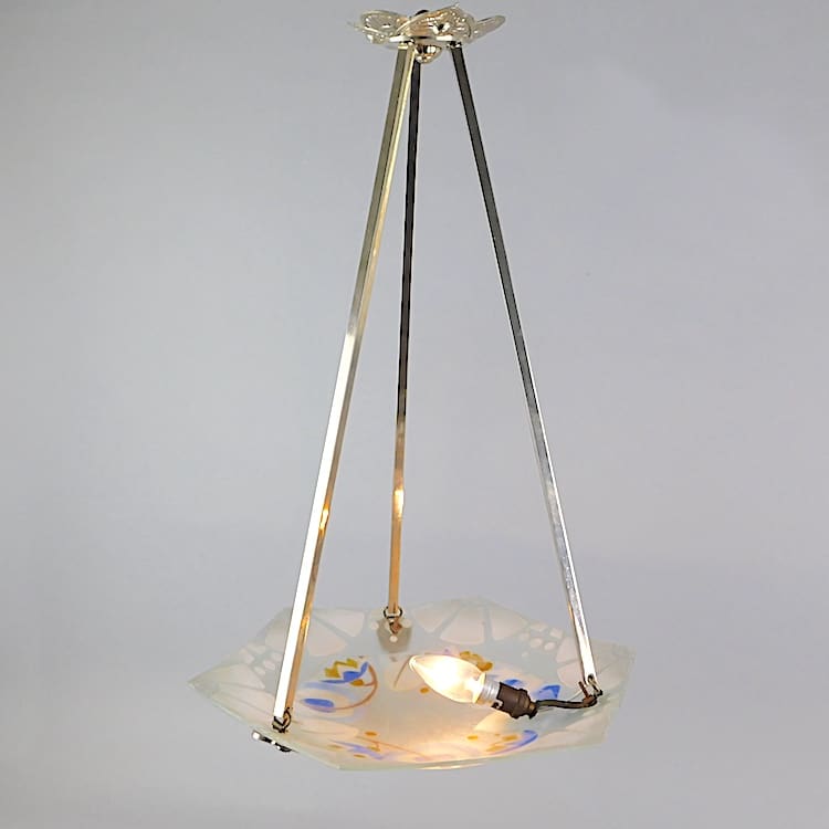 French art deco ceiling light signed by the artist, Gyp, with chromed square metal hanging arms, a chromed bronze floral ceiling rose and chromed bronze studs. Brightly painted in white, brown, blue and gold enamels and with etched petal detail.