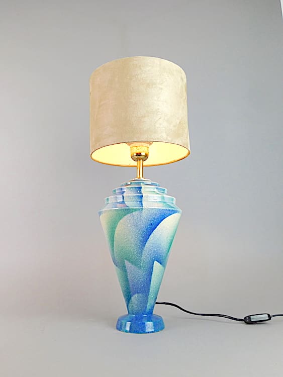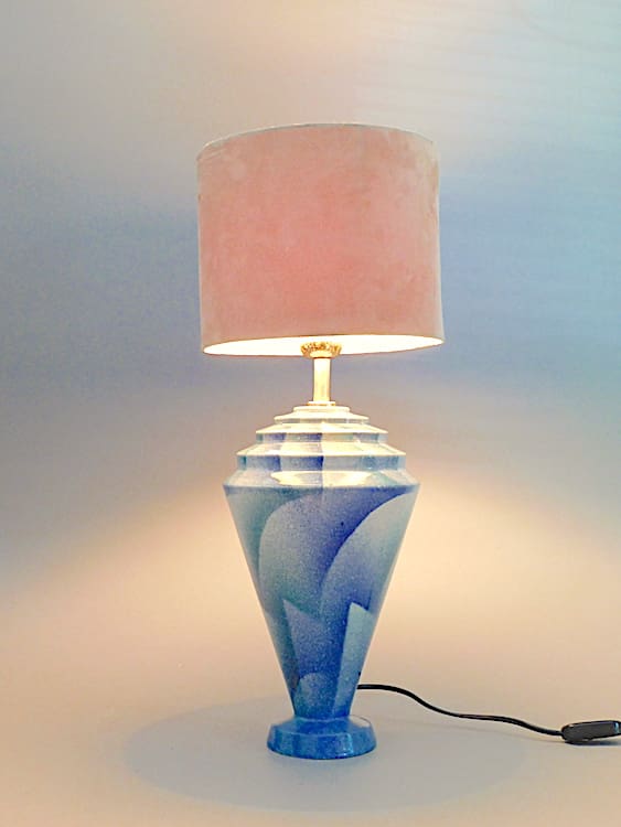 A large and rare terracotta lamp with blue geometric speckled glaze, signed by Marcel Guillard and with the Etling, Paris mark.