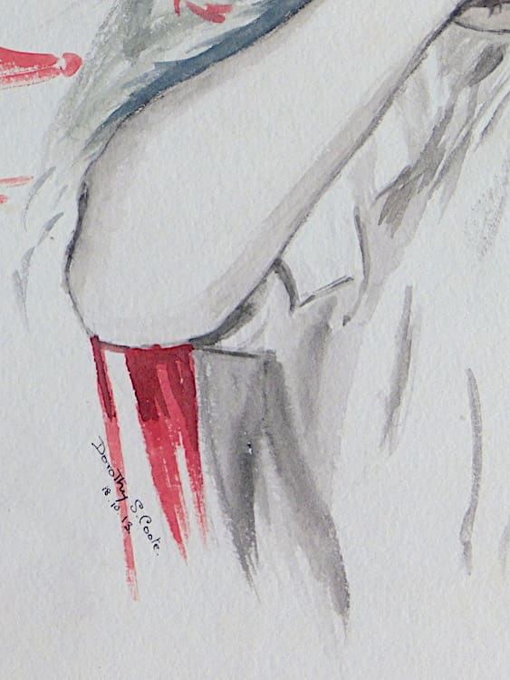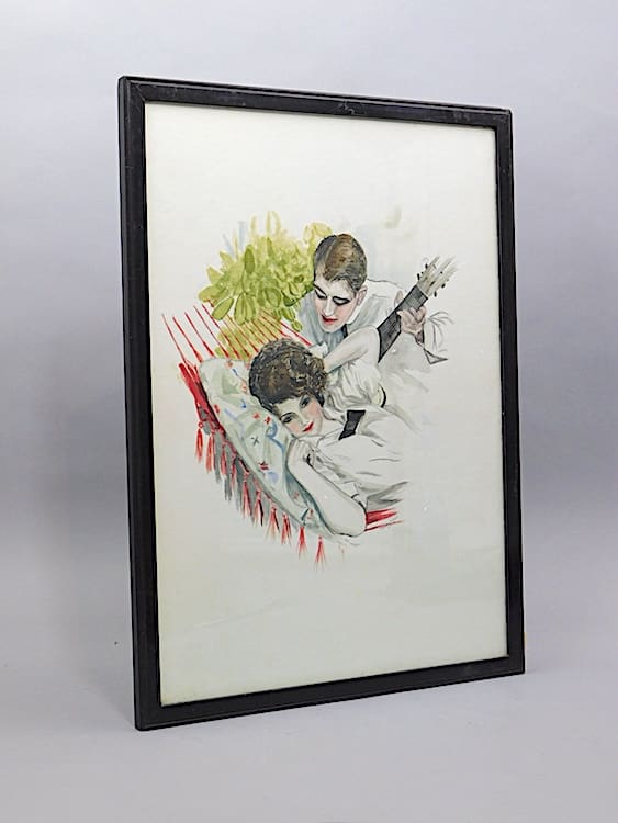 Original signed watercolour by Dorothy S. Coote, dated 1918, of a man serenading a lady in a hammock. Framed in a blackwood frame.