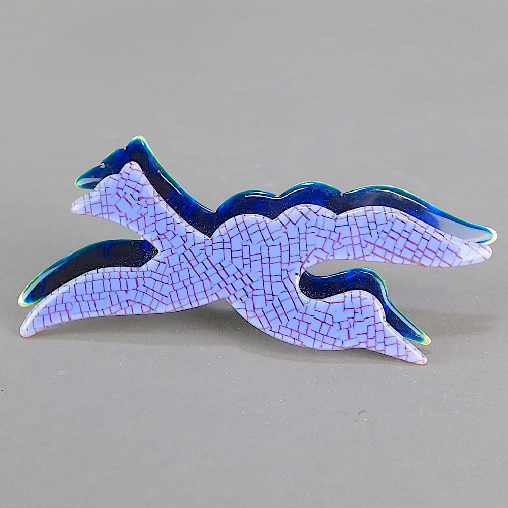 A purple and blue Lea Stein silhouette brooch of a bird.