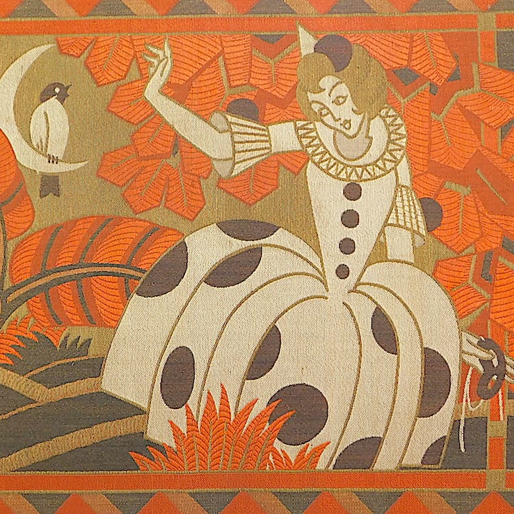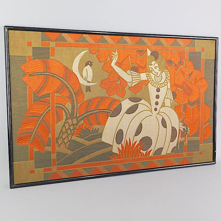 French silk picture of a columbine and owl, mounted in a black wood frame.