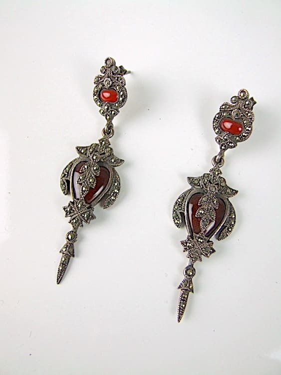 Vintage silver and amber onyx earrings with rhinestone detail made for pierced ears. Hallmarked.