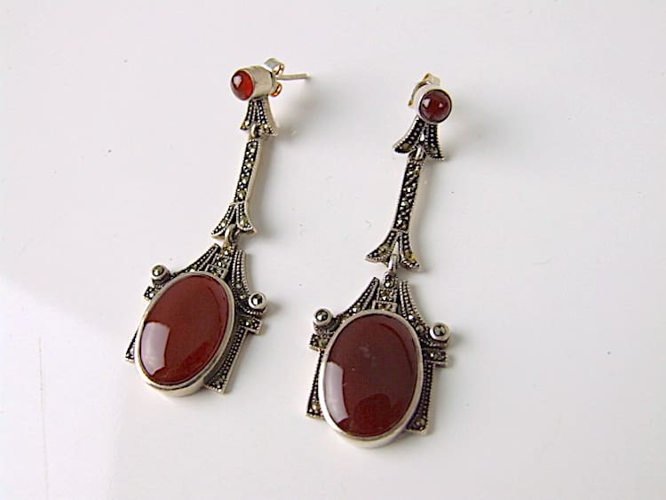 Vintage silver and amber onyx earrings with rhinestone detail made for pierced ears and hallmarked.