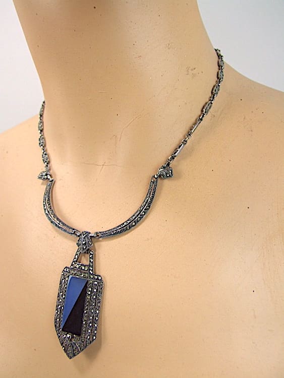 Sterling silver art deco necklace with blue and black glass panel and rhinestone detailing. Marked to the back Sterling and bearing a makers impressed mark which I cannot read but probably by Theodore Fahrner. The chain is very ornate and has rhinestone detail and the craftsmanship is exquisite.