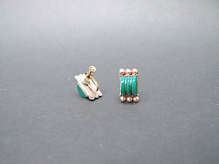 Mexican silver Taxco 1930’s earrings with green ribbed glass panels. Made with screw fittings.