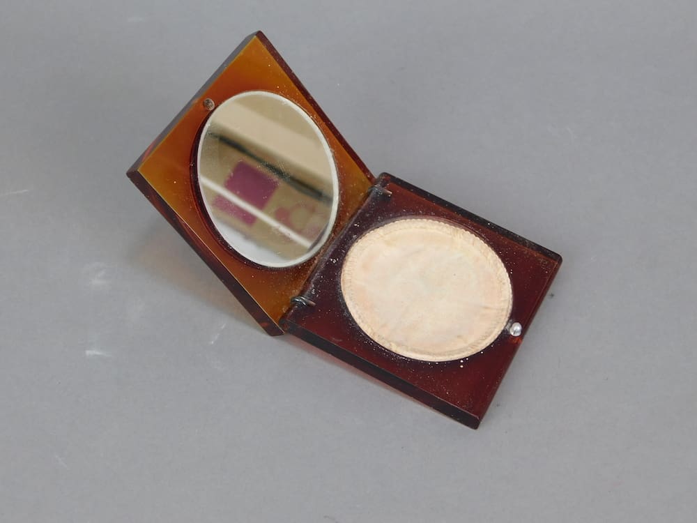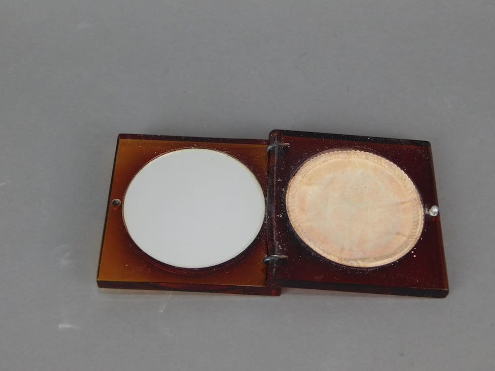 French amber celluloid compact with central silver metal love birds plaque. Inside there is a used puff and a mirror inside the lid.