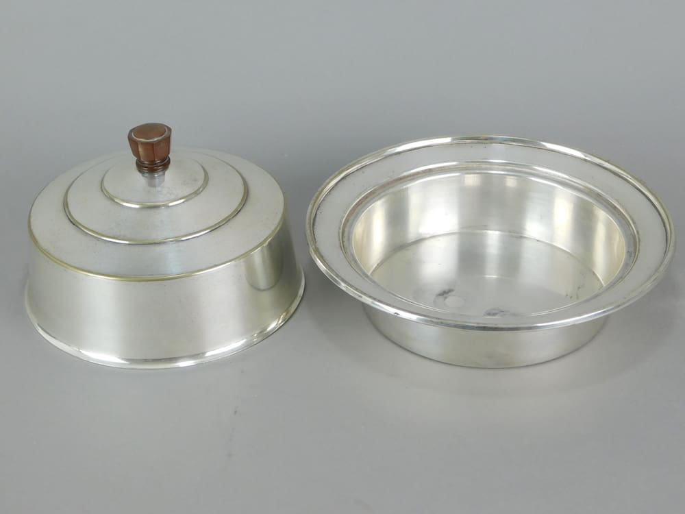 English art deco silver plated dish with brown bakelite handle. It bears some hallmarks to the base and Made in England.