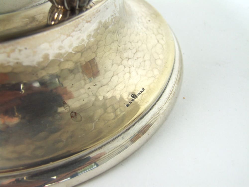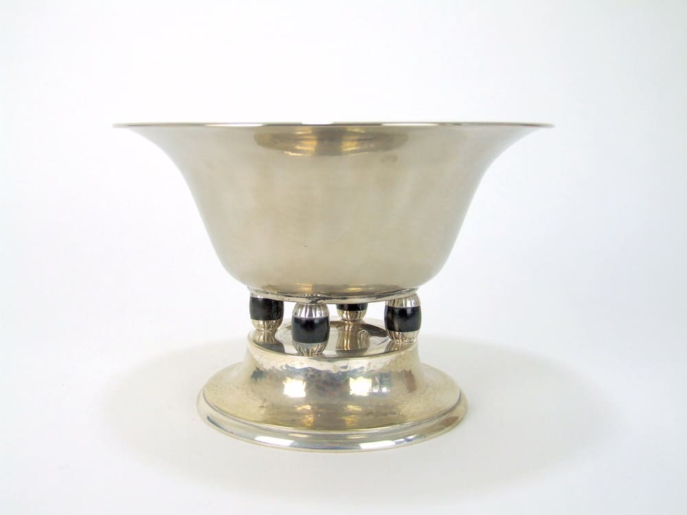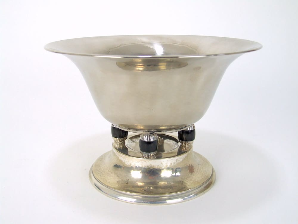 A fine quality art deco bowl mounted on four carved black macassar ebony acorn feet and with a fine hammered metal finish. Recently polished and in very good original condition. Makers name and possibly hall mark stamped to the base.