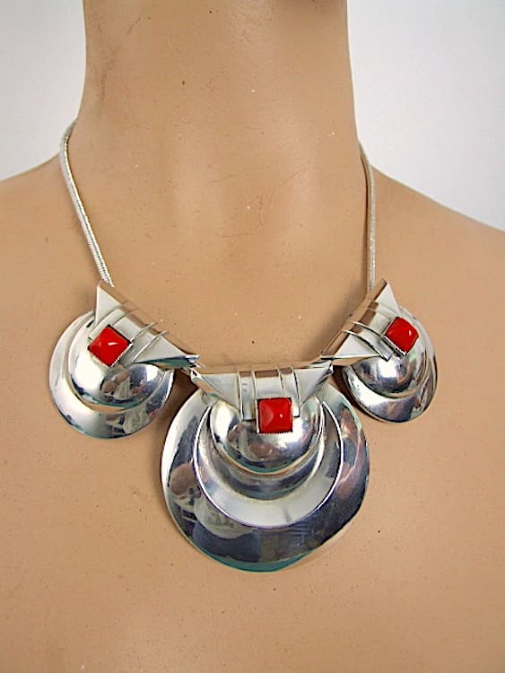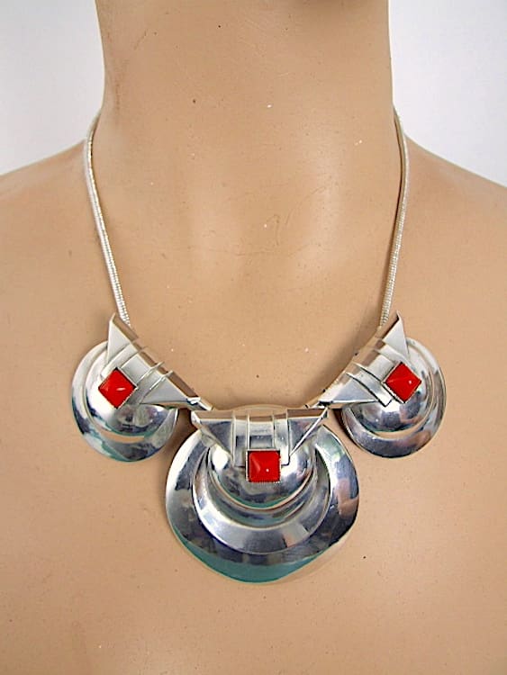 A French silvered metal necklace with odillon detail and with pyramid shaped red onyx cabochons. Marked Depose to the reverse.