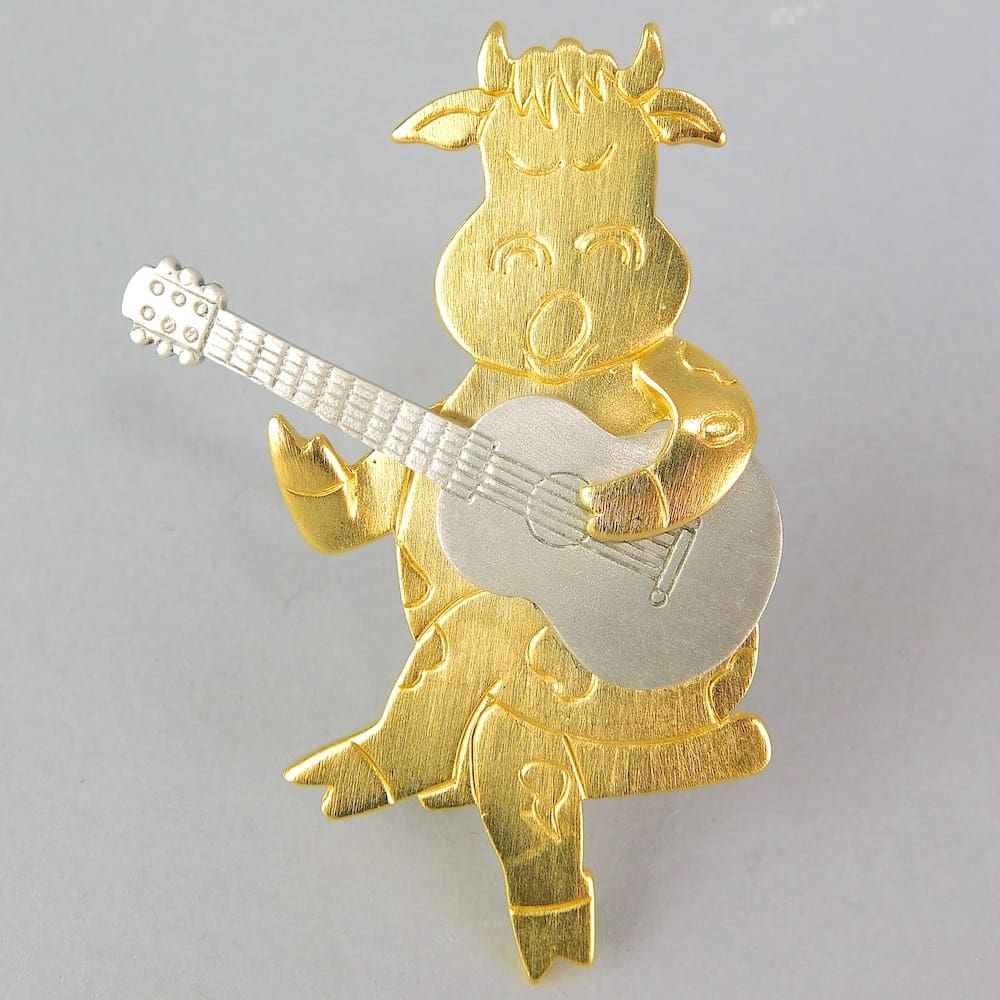 Gilt and silvered metal brooch with a cow playing the guitar. Signed to the roll safety clasp on the reverse.