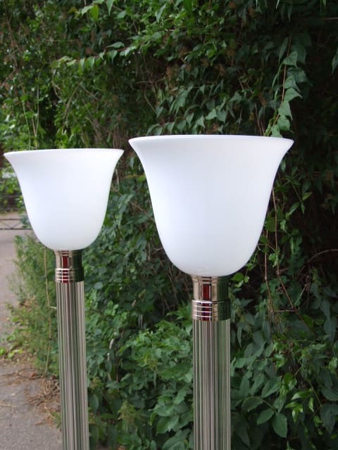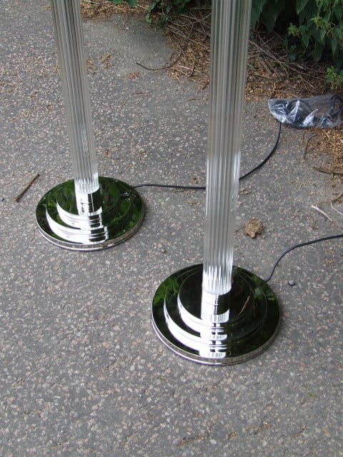 Modern standard lamp made in France, with ribbed glass stem detail. Only one now available as the other is sold. The stem is made of ribbed glass and the base is made of silvered stepped metal plate. There is one bulb holder to the top uplighter.