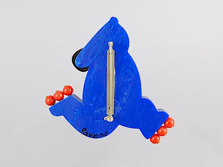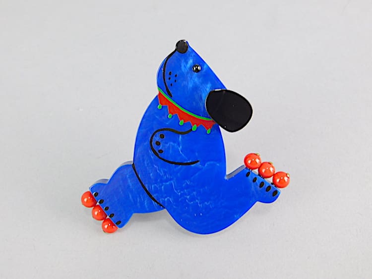 Vintage hand painted galalith skating bear brooch by Marie-Christine Pavone.