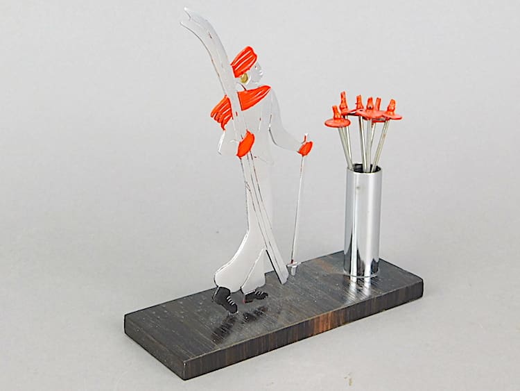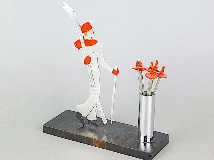French art deco female skier cocktails sticks set – an unsigned Sudre. The ski poles re the cocktail sticks. Macassar ebony base.