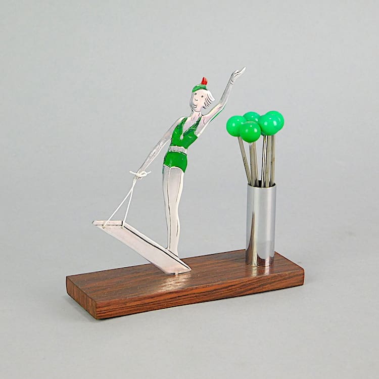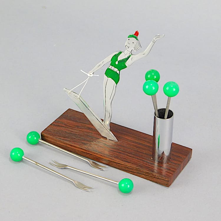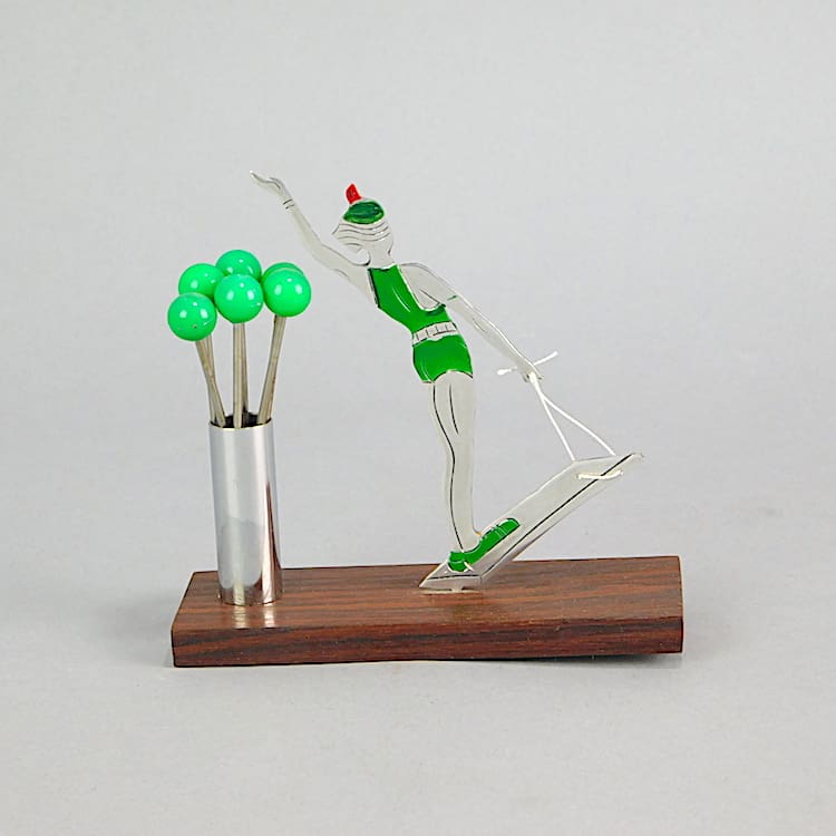 French macassar based cocktail sticks set. Unsigned but undoubtedly by Sudre. She is enamelled in green and red and is a water skier.