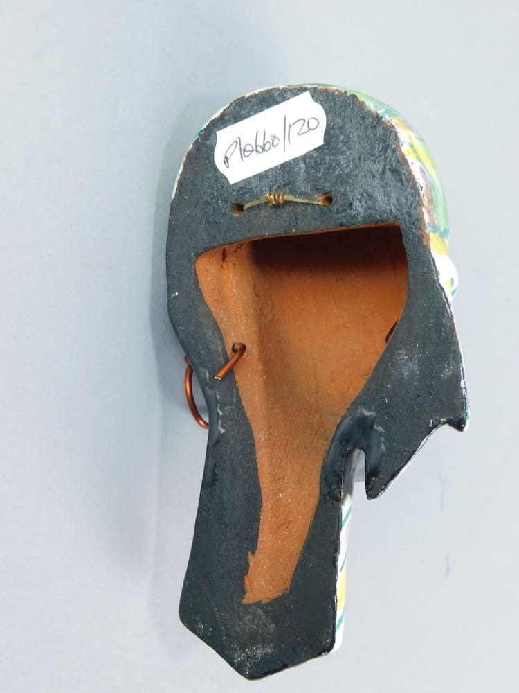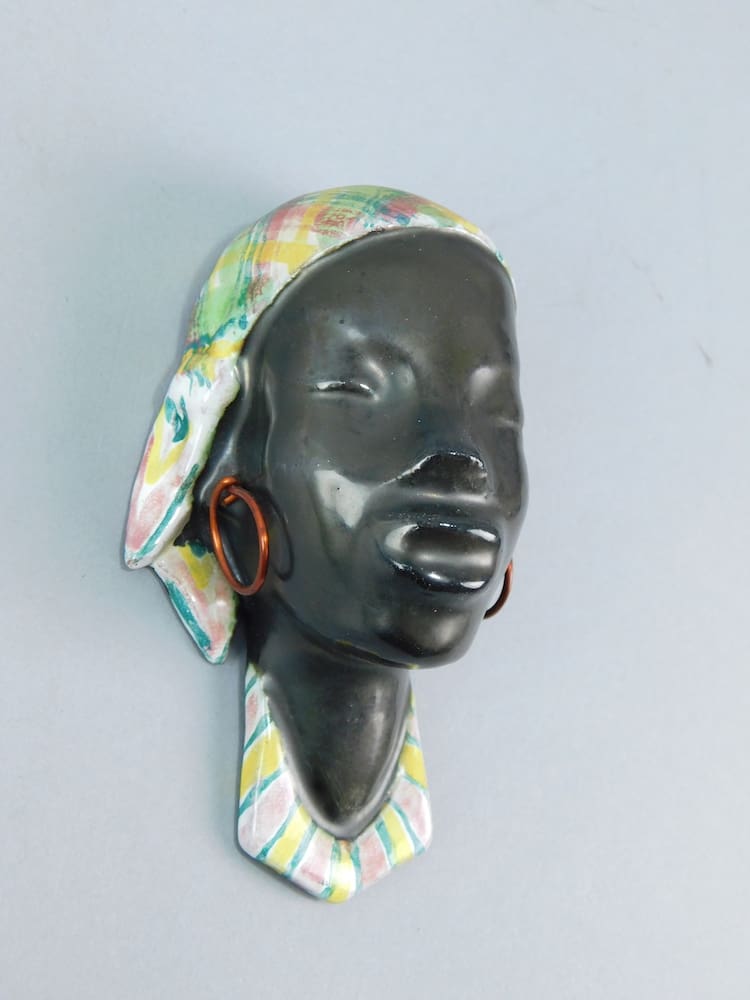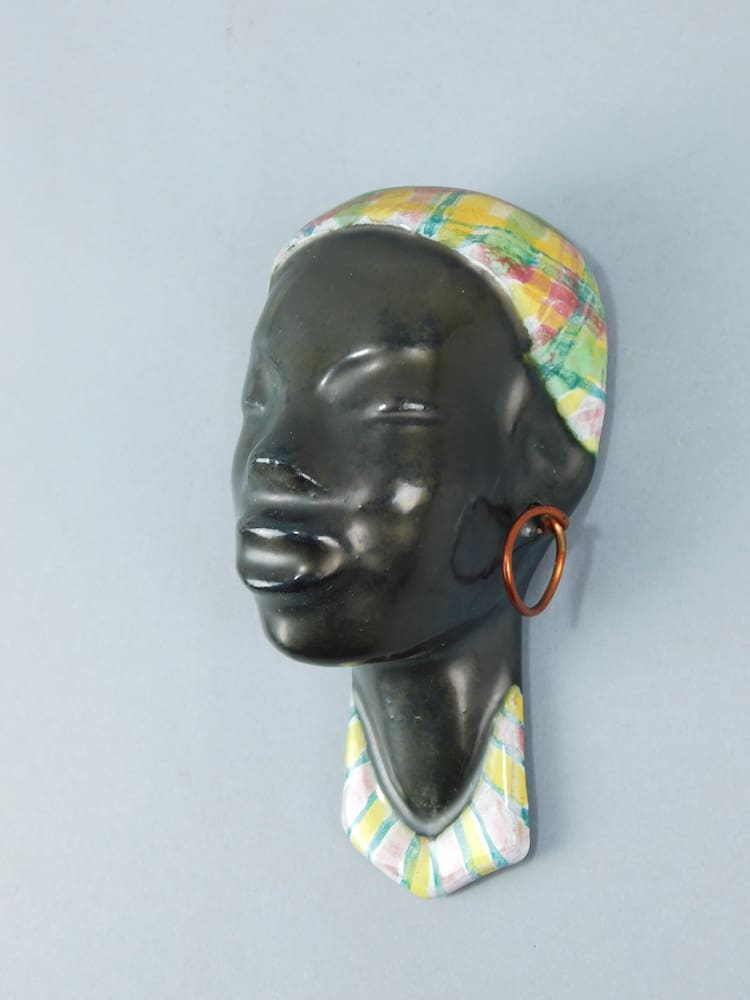 A stylish African tribal mask, complete with its original hoop earrings. She is made of terracotta and probably Austrian. No makers marks. This mask was recently hired to the BBC for a programme about Art Deco architecture, filmed at Casa Del Rio, Devon.