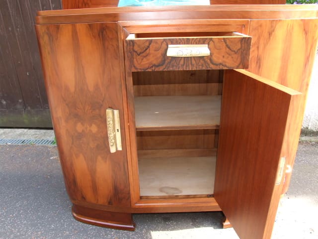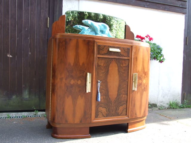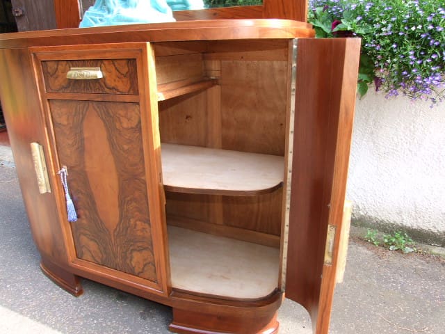 French walnut buffet with wooden framed mirrored back panel to the top which can be removed easily if required. Wonderful figuring to the walnut door panels and with bronze stylised floral handles.