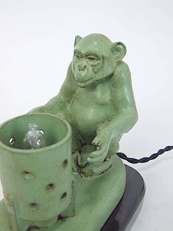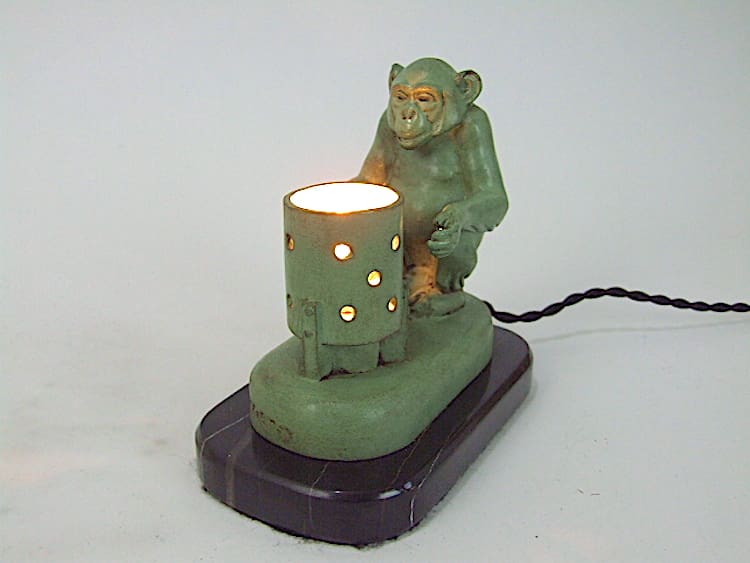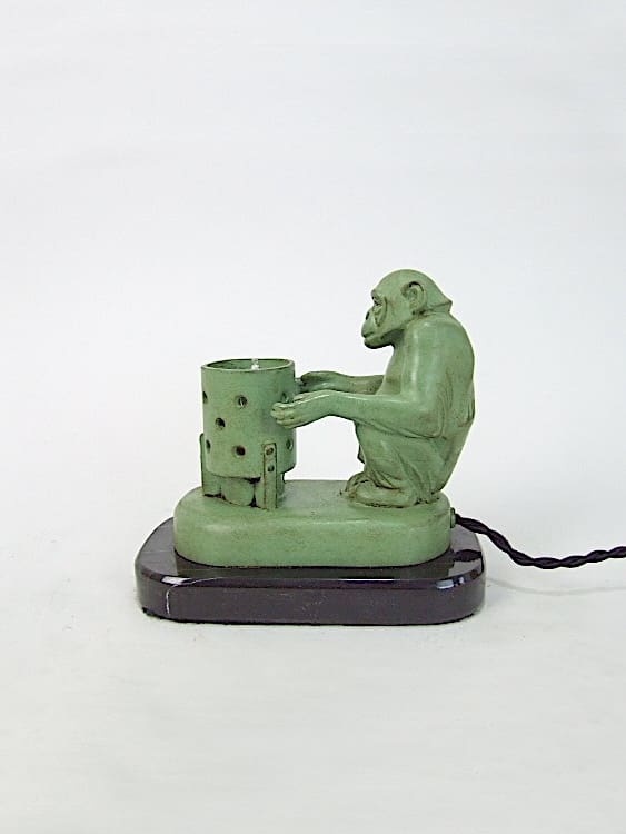 A small French art deco monkey table lamp – designed in the 1920s and made by the Le Verrier foundry. These is a small bulb inside the brazier fire. Signed to the base and bearing the foundry stamp.