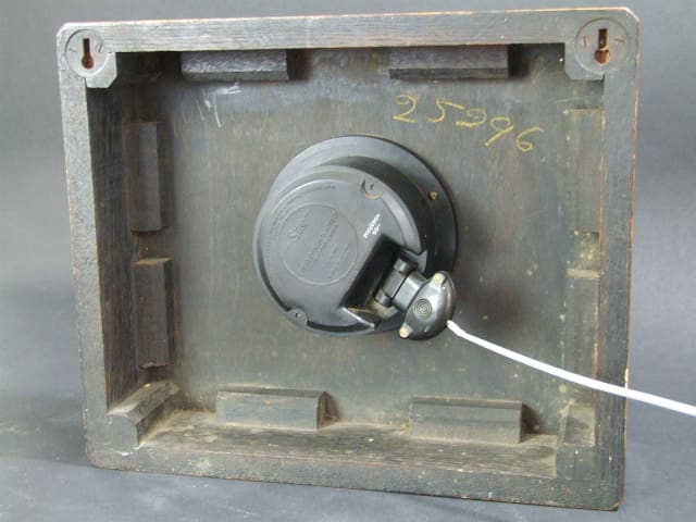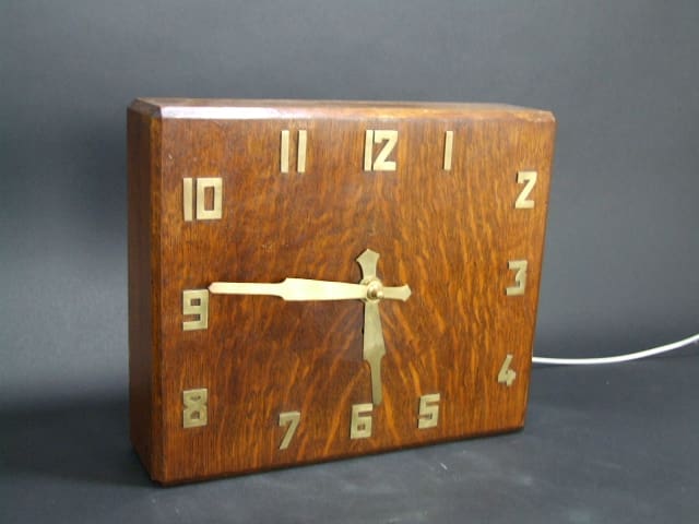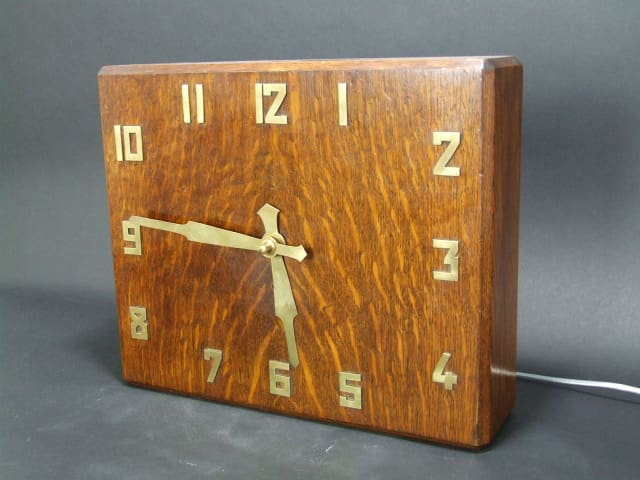 Wood cased wall clock with gilt metal hands. Marked Smiths clocks England to the bakelite rear movement holder. It has an electric movement and it has been running but a very good candidate for a quartz movement.