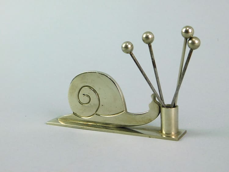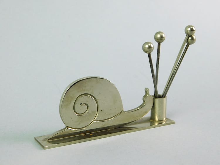 French art deco chromed metal 2-dimensional snail cocktail sticks set. I believe designed by Benjamin Rabier with four sticks.