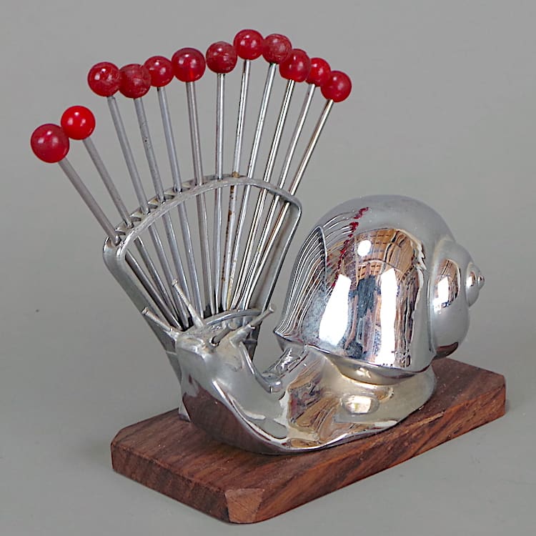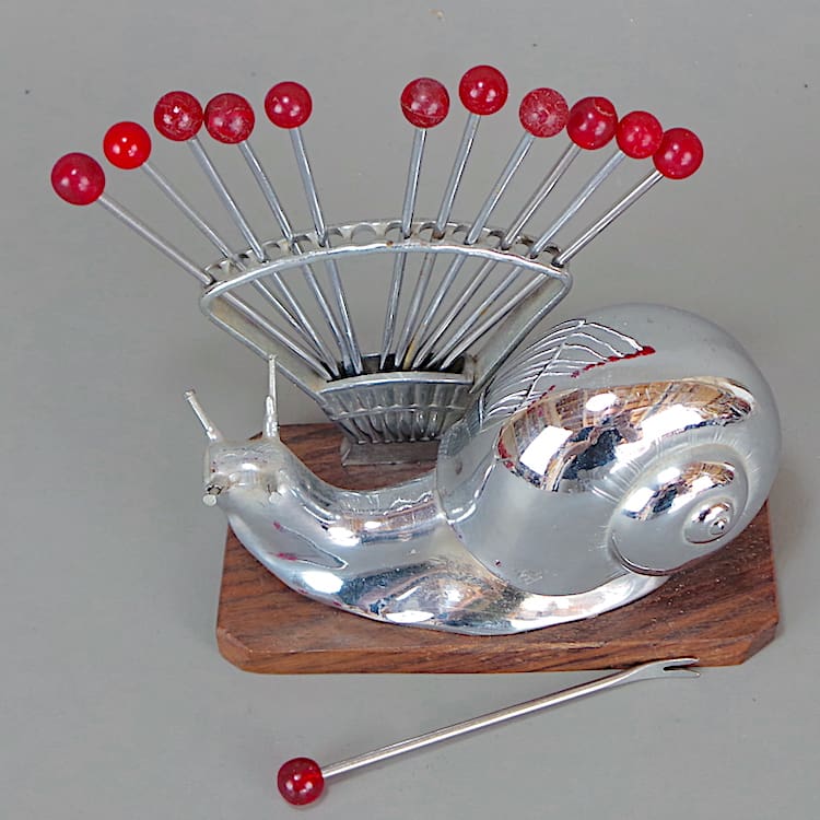 French Art Deco chromed metal snail cocktail sticks holder Designed by Benjamin Rabier circa 1920s.