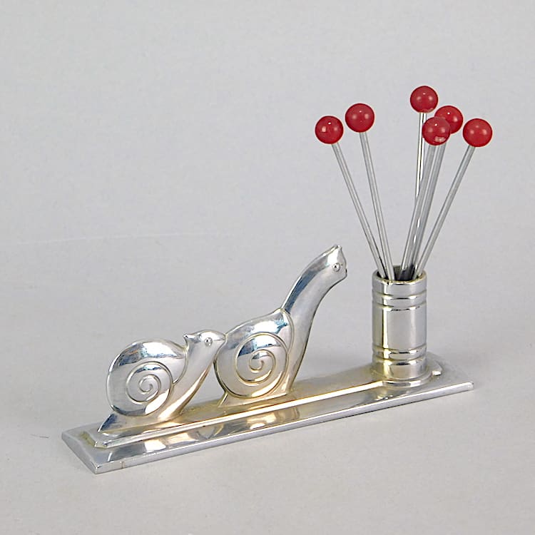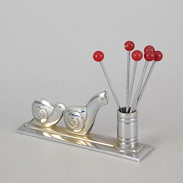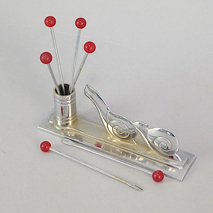 French modernist two dimensional snail cocktail sticks set. It has 6 phenolic handled cocktail sticks.