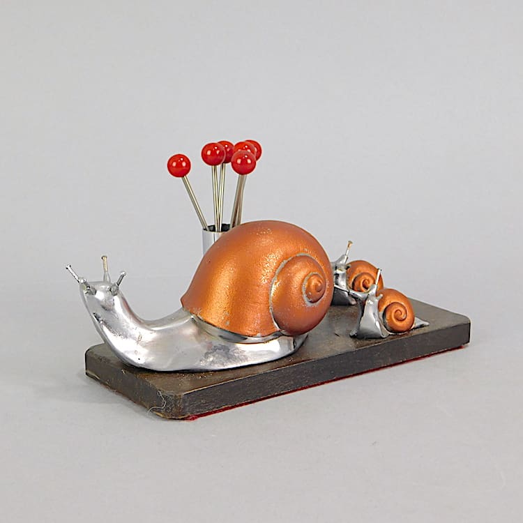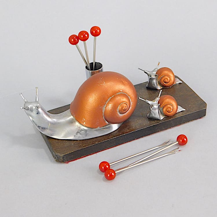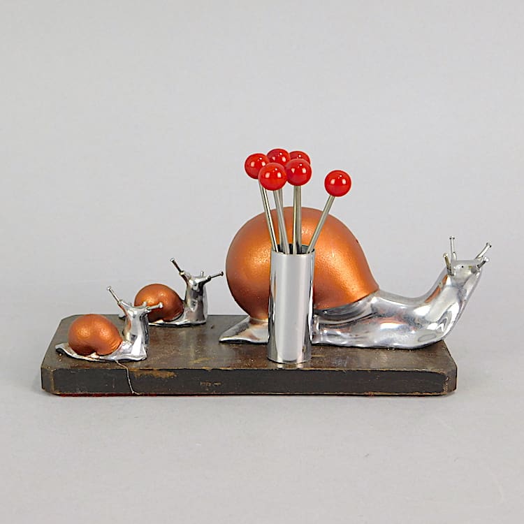 French Art Deco chromed spelter snail family cocktail sticks set. It has 6 cocktail sticks with red phenolic handles. Mounted on a wooden base.