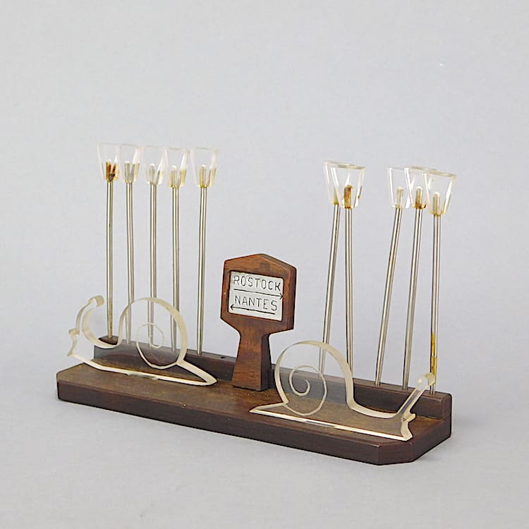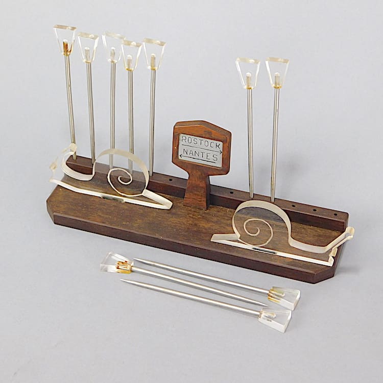 French Art Deco lucite cocktails sticks set depicting 2 snails passing each other one going to Rostock and the other to Nantes. Unsigned but probably designed by Benjamin Rabier. It has 10 sticks but 2 are missing.